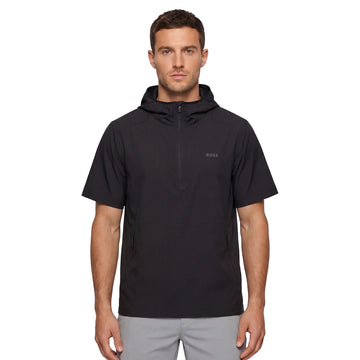 Mens BOSS L_CruiseLite Short Sleeve Hoodie Windshirt. A performance, hooded golf jacket constructed from a technical, lightweight fabric which has a water repellant fabric for protection, while four way stretch provides maximum freedom of movement.