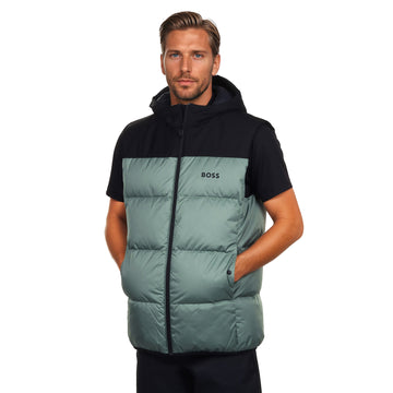 Mens BOSS OW_Block-X Vest WI25. A cosy essential on cold days, this water-repellent BOSS Menswear gilet features an adjustable hood and elasticated hem. Certified duck down and feather filling.