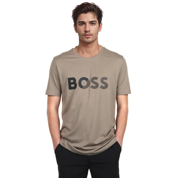 Mens BOSS Tee Tape Logo SP25. A crew neck, signature T-shirt with a large logo. This top is cut to a regular fit in soft jersey with a compact structure.