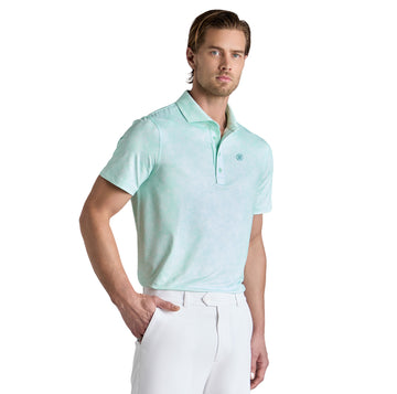 Mens G/FORE Hydrangea Tech Jersey Polo. A soft tech jersey polo featuring an all over floral print plus a self fabric spread collar with a collar stand.