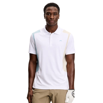Mens J.Lindeberg Golf Legacy Polo Shirt. A three button hidden placket, polo shirt constructed from a soft TX Jersey fabric with eye-catching colour-block Bridge inserts to the shoulders.
