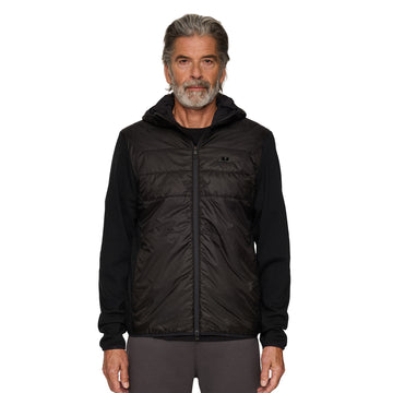 Mens J.Lindeberg Gregory Hybrid Hooded Jacket. A technical hybrid jacket which artfully combines the warmth of Merino Wool and advanced Aether Soft fabric, which also features padded panels at the front.