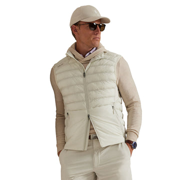 Mens RLX Ralph Lauren Quilted Full Zip Vest. Crafted from water-repellent fabric, this lightweight vest is ergonomically panelled with stretch jersey for ease of movement and insulated with down-alternative fill. It features slots at the waist pockets for hand warmers as well as a scorecard compartment at the interior.