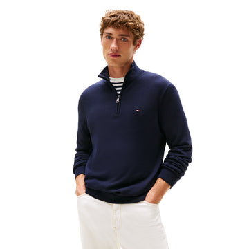 Mens Tommy Hilfiger Essential Cotton 1/4 Zip. Breathable pure cotton makes this half-zip jumper an ideal layering piece during the transeasonal months, while flag embroidery adds a signature finish.