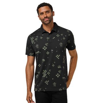 Mens TravisMathew Beverage Cart Polo. Your unofficial “yes, I’m playing well today” polo. The BEVERAGE CART POLO remixes the Mapes golf graphics into a playful, abstract all-over print—pixel palms, carts, and cold drinks included. Made with performance fabrication to keep things comfortable when the round heats up.